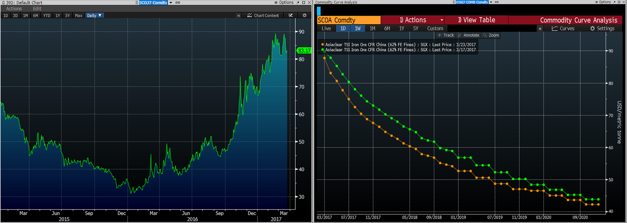 April SGX iron futures fell to $83/t with the IODEX printing $84.75/t Wednesday night. Iron ore’s steep backwardation may be the primary reason US Midwest HRC prices are backwardated.