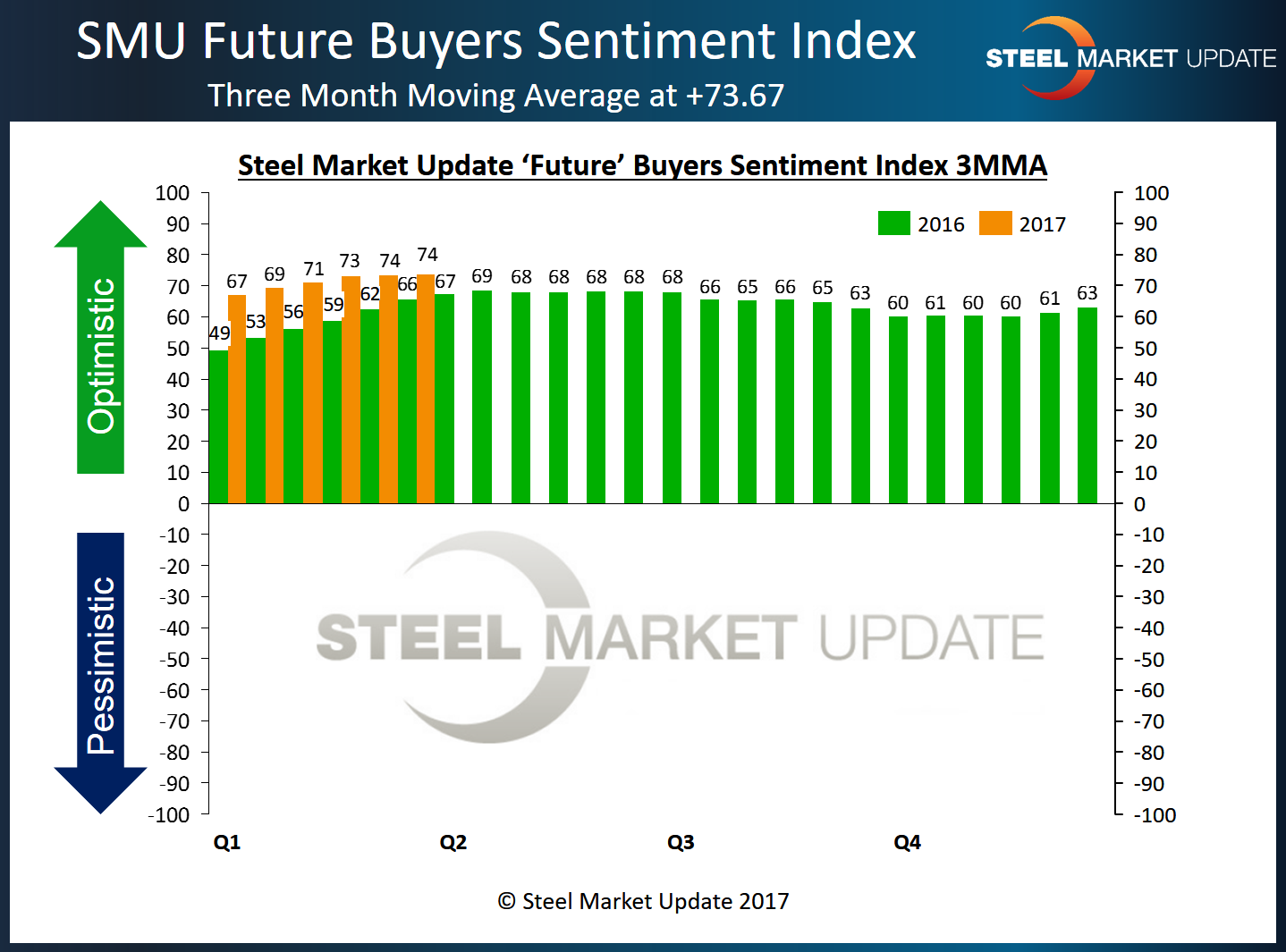 Our Current Sentiment Index as a single data point came in at +73. This is down 4 points from the +77 reported at the beginning of the month. Our Current Sentiment Index has consistently been over +70 for the past three months. Buyers and sellers of flat rolled steel continue to be very optimistic about their companies’ ability to be successful in the existing or current market environment.