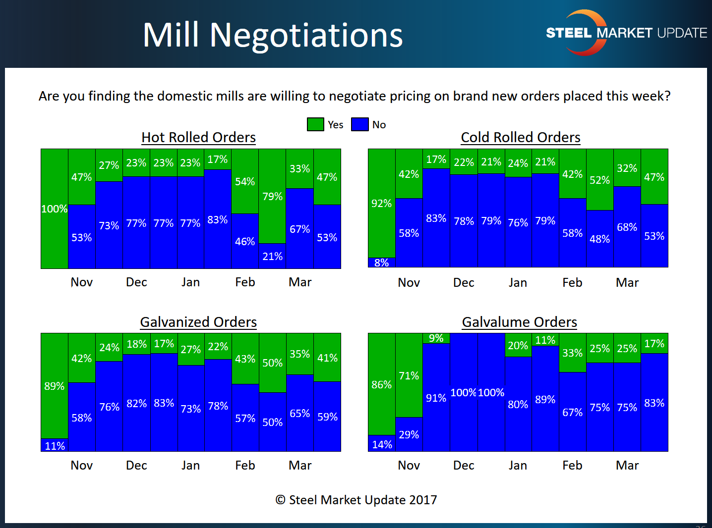 We found 47 percent of our respondents reporting the domestic mills as willing to negotiate HRC pricing. This is up from the 33 percent level we reported at the beginning of March. At the same time, it is a long way away from the 79 percent we saw one month ago.