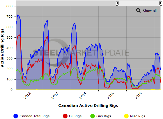 The Canadian rig count decreased by 91 to 185 rigs this past week, with oil rigs down 79 to 70 rigs, gas rigs down 11 to 114 rigs, and miscellaneous rigs down 1 to 1 rig. Compared to last year the 185 count is up 130 rigs, with oil rigs up 59, gas rigs up 70, and miscellaneous rigs up 1. International rigs increased by 8 to 941 rigs for the month of February, a decrease of 77 rigs from the same month one year ago. For a history of both the US and Canadian rig count, visit the Steel Market Update website here.