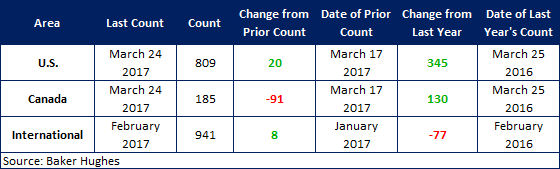 According to Baker Hughes data from March 24, 2017, the U.S rig count for the week was 809 rigs exploring for or developing oil or natural gas. This is up 20 rigs compared to last week, with oil rigs up 21 to 652 rigs, gas rigs down 2 to 155 rigs, and miscellaneous rigs up 1 to 2 rigs. Compared to this time last year, the 809 count is up 345 rigs, with oil rigs up 280, gas rigs up 63, and miscellaneous rigs up 2.
