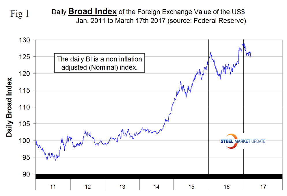 Explanation of Data Sources: The Broad Index is published by the Federal Reserve on both a daily and monthly basis. It is a weighted average of the foreign exchange values of the U.S. dollar against the currencies of a large group of major U.S. trading partners. The index weights, which change over time, are derived from U.S. export shares and from U.S. and foreign import shares. The data are noon buying rates in New York for cable transfers payable in the listed currencies. At SMU we use the historical exchange rates published in the Oanda Forex trading platform to track the currency value of the US $ against that of sixteen steel trading nations. Oanda operates within the guidelines of six major regulatory authorities around the world and provides access to over 70 currency pairs. Approximately $4 trillion US $ are traded every day on foreign exchange markets.