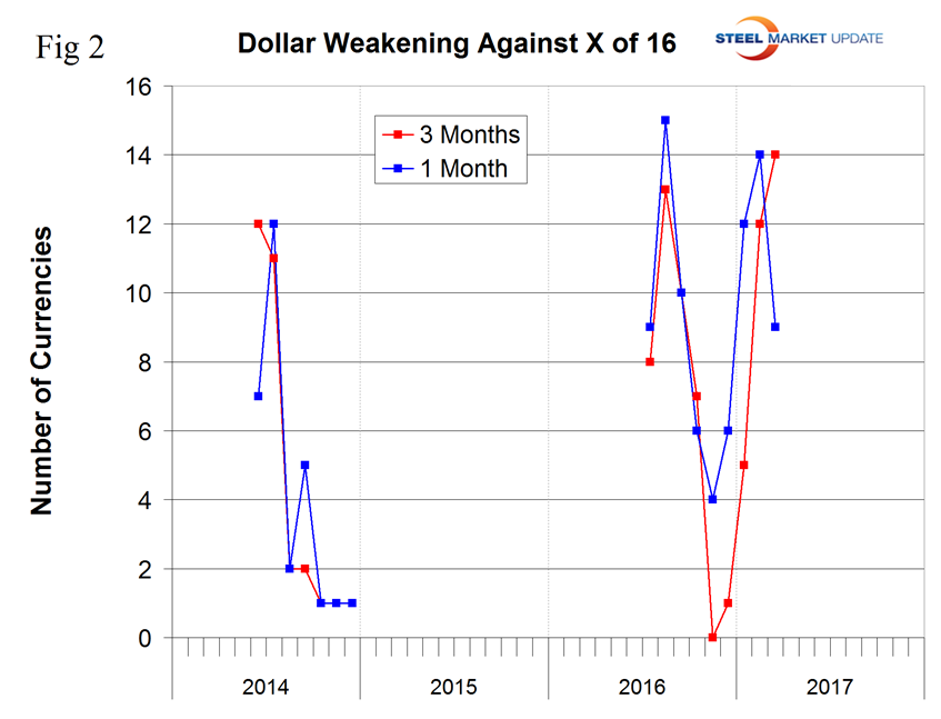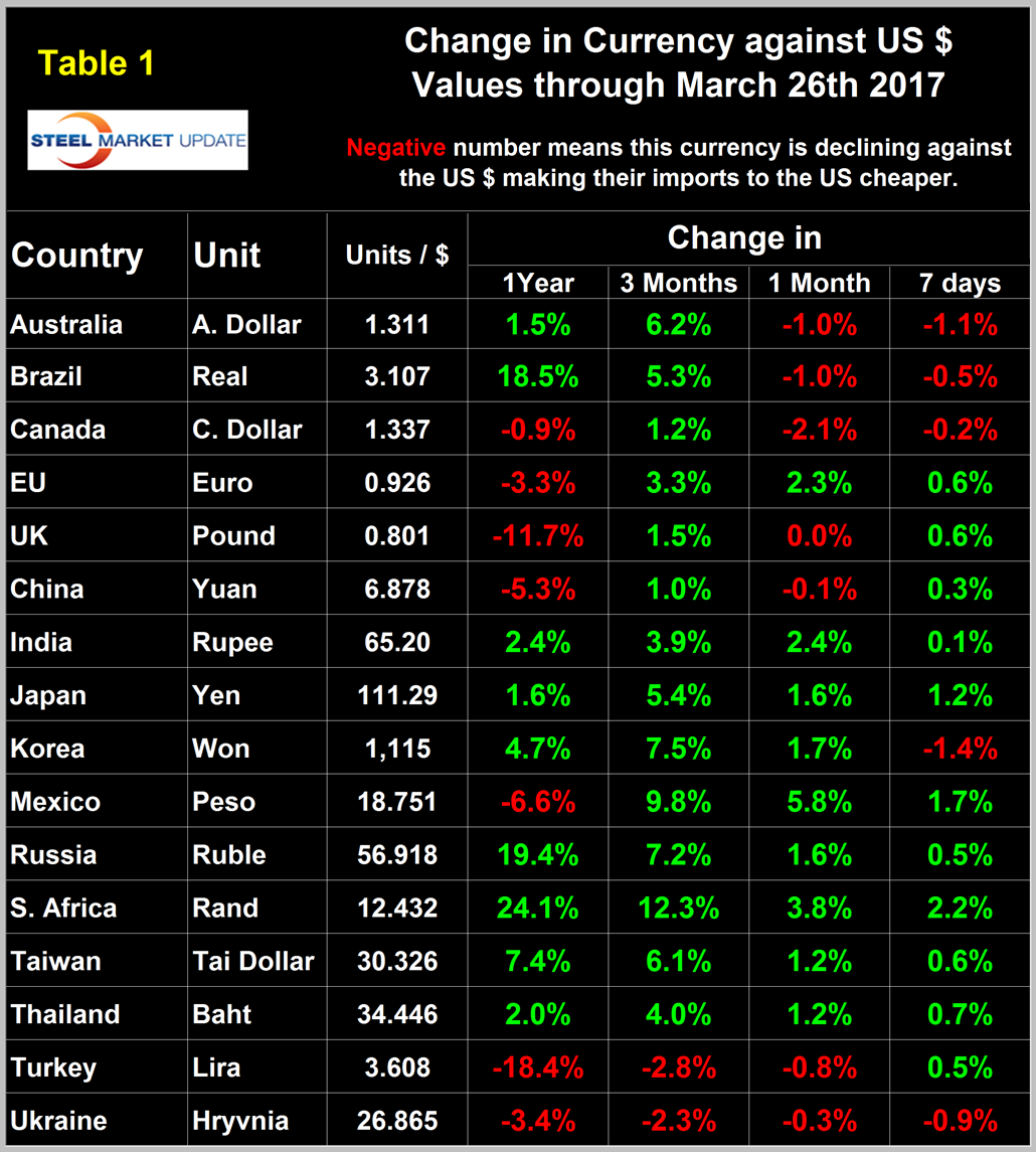 It took a lot of digging to get as far as we did with this analysis and we will finish it off next month. However it does show very dramatically how the direction in the value of the dollar on a rolling 3 month comparison has done a complete reversal between November 2016 when it was strengthening against all sixteen to March 2017 when it weakened against fourteen of the sixteen. Table 1 is color coded to indicate strengthening of the dollar in red and weakening in green. We regard strengthening of the US Dollar as negative and weakening as positive because the effect on net imports. The March 26th version of Table 1 has the dollar weakening against nine of the sixteen at the one month level and against eleven of the sixteen at the seven day level.