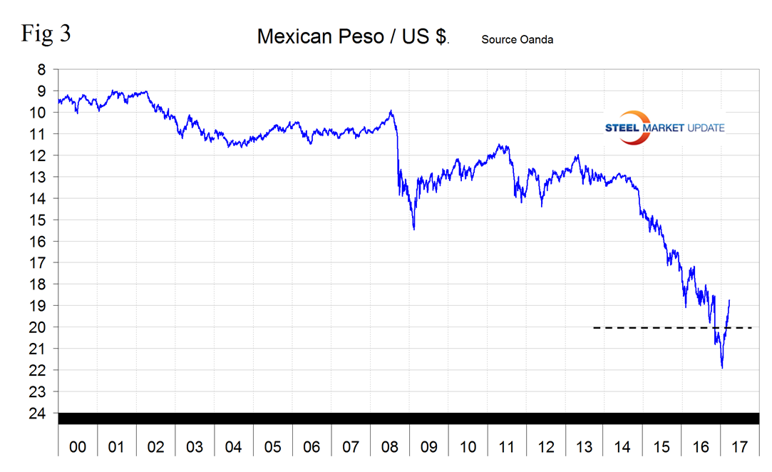 The Peso has appreciated by 9.8 percent in three months, 5.8 percent in one month and by 1.7 percent in seven days. On January 1st 1994, when the NAFTA was initiated it took only 3.5 pesos to buy one US dollar.