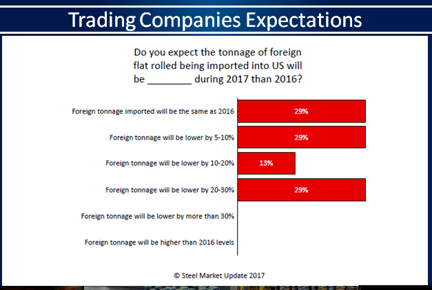 If you believe what traders have been telling Steel Market Update in our surveys the expectation is for 2017 to see imports at worst remain the same as 2016 and most of the trading companies were telling us that they would drop by 10 to 25 percent.