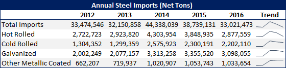 In the table below, we are showing total imports for the years 2012-2016. We are also displaying the hot rolled, cold rolled, galvanized and other metallic (mostly Galvalume) and it is important to review the data to see how successful the trade cases have been at stopping the flow of foreign steel into the U.S.