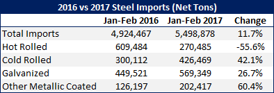 So, we take a look at the first two months of 2017 import data from the U.S. Department of Commerce. We are finding total imports are up 11.7 percent. Hot rolled imports dropped 55.6 percent. Cold rolled imports rose by 42.1 percent, galvanized up by 26.7 percent and other metallic coated up 60.4 percent.