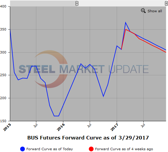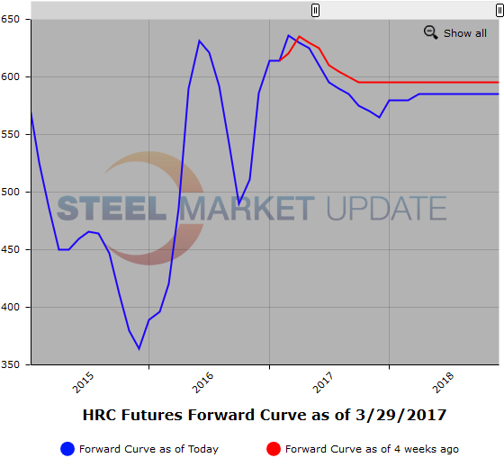 The past week just over 15,000 ST traded with the bulk of the volume trading in Q2/Q4’17. The futures curve for 12 months forward declined on average about $15/ST with the volumes pretty evenly spread across the balance of 2017. Inquiries for the first 2 quarters of 2018 picked up this past week, however only Jan’18 and Feb’18 traded this past week at roughly $580/ST. The main deals this week were two Apr/Feb’18 strips which traded at an average price of just north of $600/ST which represents a pretty good discount to the current spot level. While market forecasts point to fairly steady HR demand for the remainder of the year market sentiment remains mixed. April prime scrap prices will remain the focus as the market looks for clear signals on where HR prices are headed.