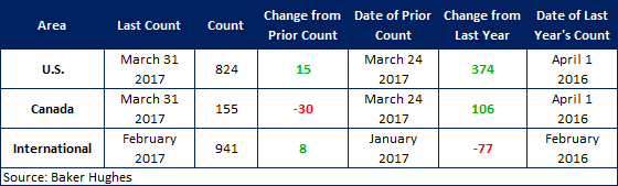 According to Baker Hughes data from March 31, 2017, the U.S rig count for the week was 824 rigs exploring for or developing oil or natural gas. This is up 15 rigs compared to last week, with oil rigs up 10 to 662 rigs, gas rigs up 5 to 160 rigs, and miscellaneous rigs unchanged at 2 rigs. Compared to this time last year, the 824 count is up 374 rigs, with oil rigs up 300, gas rigs up 72, and miscellaneous rigs up 2.