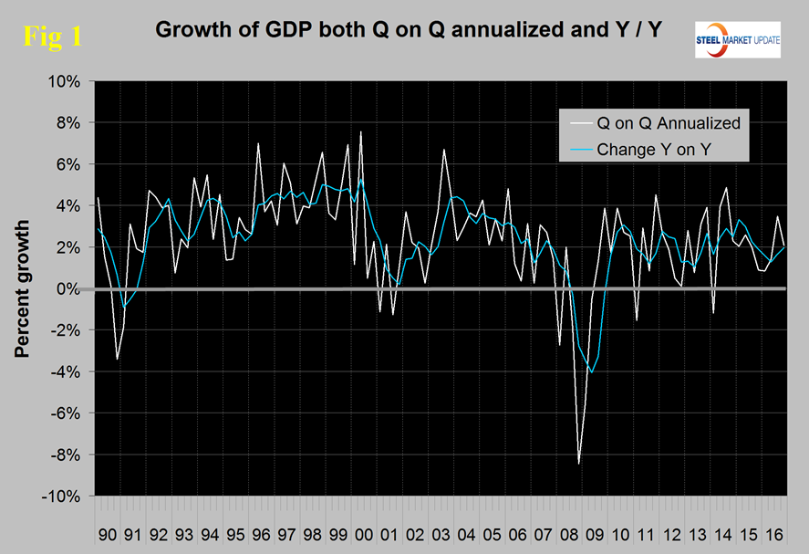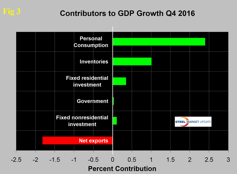 SMU Comment: The strong dollar resulted in a large negative contribution of net exports and that won’t change for the better anytime soon. The growth in personal consumption was the second highest of the last eight quarters which we expect to be a bright spot as consumer confidence translates into consumer spending. The growth of inventories made a large contribution to Q4 but as we reported above this is simply moving growth from one time period to another. Historically it has been necessary to have about a 2.5 percent growth in GDP to get any growth in steel demand so this latest estimate of GDP suggest that at least steel demand won’t contract in the immediate future. This relationship is a long term average and in reality steel is much more volatile than GDP. If GDP takes a dive then steel demand craters and if GDP takes a sudden upturn steel soars. Neither of these extremes is evident at present.
