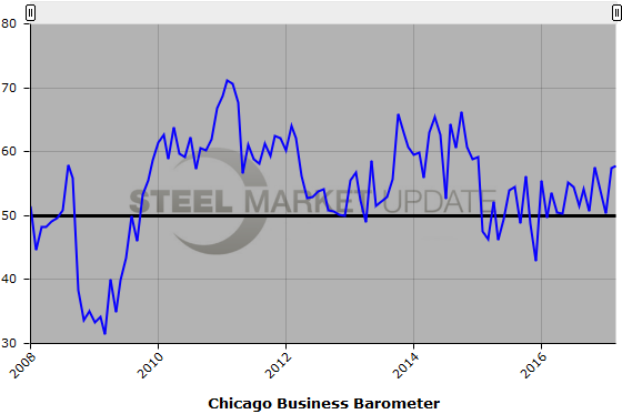 Below is a graph showing the history of the Chicago Business Barometer. You will need to view the graph on our website to use its interactive features, you can do so by clicking here. If you need assistance logging into or navigating the website, please contact our office at 800-432-3475 or info@SteelMarketUpdate.com.
