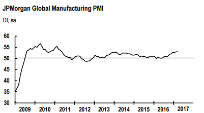 Expansion was strongest in the Eurozone reaching a near six-year high, with improvements in Germany, France, and Italy. Growth was solid but slower in the US, Japan, UK, Russia, and China, said JP Morgan.