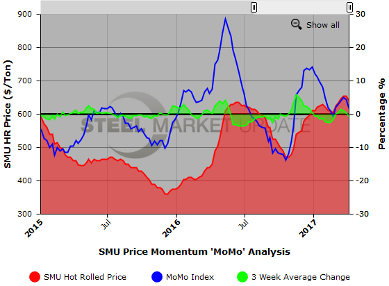 MoMo was measured at +1.65 percent this week, meaning that the current HRC price is higher than the average price over the last 12 weeks.