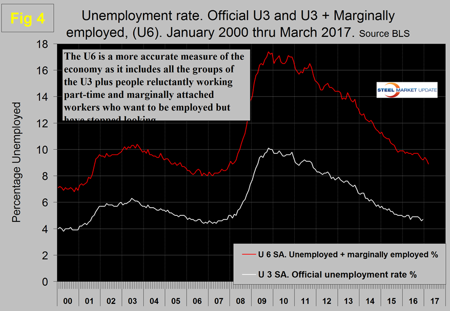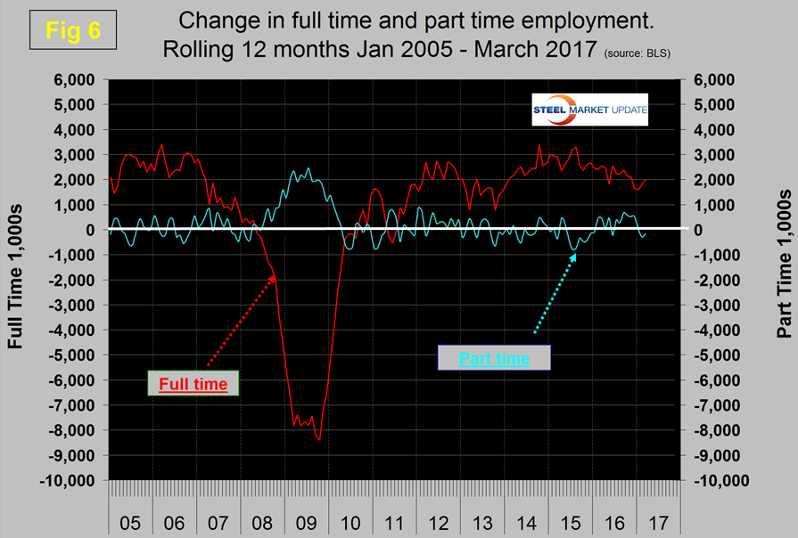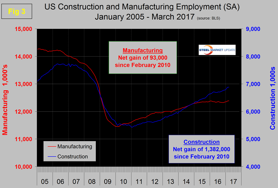 In March, manufacturing gained 11,000 positions for a total of 49,000 in the first quarter and was 0.3 percent higher than the same month in 2016 and 0.6 percent higher than in March 2015. Table 1 shows that primary metals had positive growth of almost 1 percent in the last three months. Transportation equipment including motor vehicles lost jobs in February but picked back up in March. Trucking was very strong in both February and March. Oil and gas extraction gained 1,800 jobs in the preliminary March result which was 1.0 percent. Note the subcomponents of both manufacturing and construction shown in Table 1 don’t add up to the total because we have only included those that we think have most relevance to the steel industry.