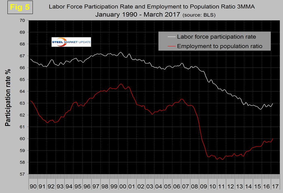 U6 includes workers working part time who desire full time work and people who want to work but are so discouraged that they have stopped looking. The differential between these rates was usually less than 4 percent before the recession but is still 4.4 percent. It has been estimated that the economy needs to create about 150,000 jobs per month to keep up with population growth. In the last five quarters the average monthly job creation has been 185,000 so the impact on unemployment has been about 35,000/month. The employment participation rate at 63 percent in March was exactly the same as March last year and not much better than the 62.7 percent reported for March 2015. We’re not sure what this is a percentage “of” because of the multiple descriptions of the labor pool. Another measure is the number employed as a percentage of the population which we think is much more definitive. In March this measure was 60.1 percent up from 59.9 percent in March last year and from 59.3 percent in March 2015. Until a year ago when it stalled, there was a gradual improvement in employment to population ratio since late 2011. Figure 5 shows both measures on one graph.
