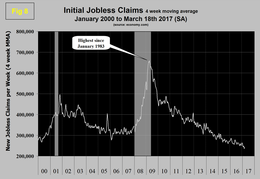 Initial claims for unemployment insurance, reported weekly by the Department of Labor have continued their downward drift this year and in w /e March 18th were 258,000 with a four week moving average of 240,000. This marks the longest streak since 1973 of initial claims below 300,000. (Figure 8). The result for w/e November 12th at 233,000 was the lowest since April 1974.