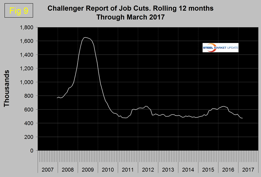 The last piece of the employment puzzle that we examine is the Challenger report which measures job cuts monthly (Figure 9).