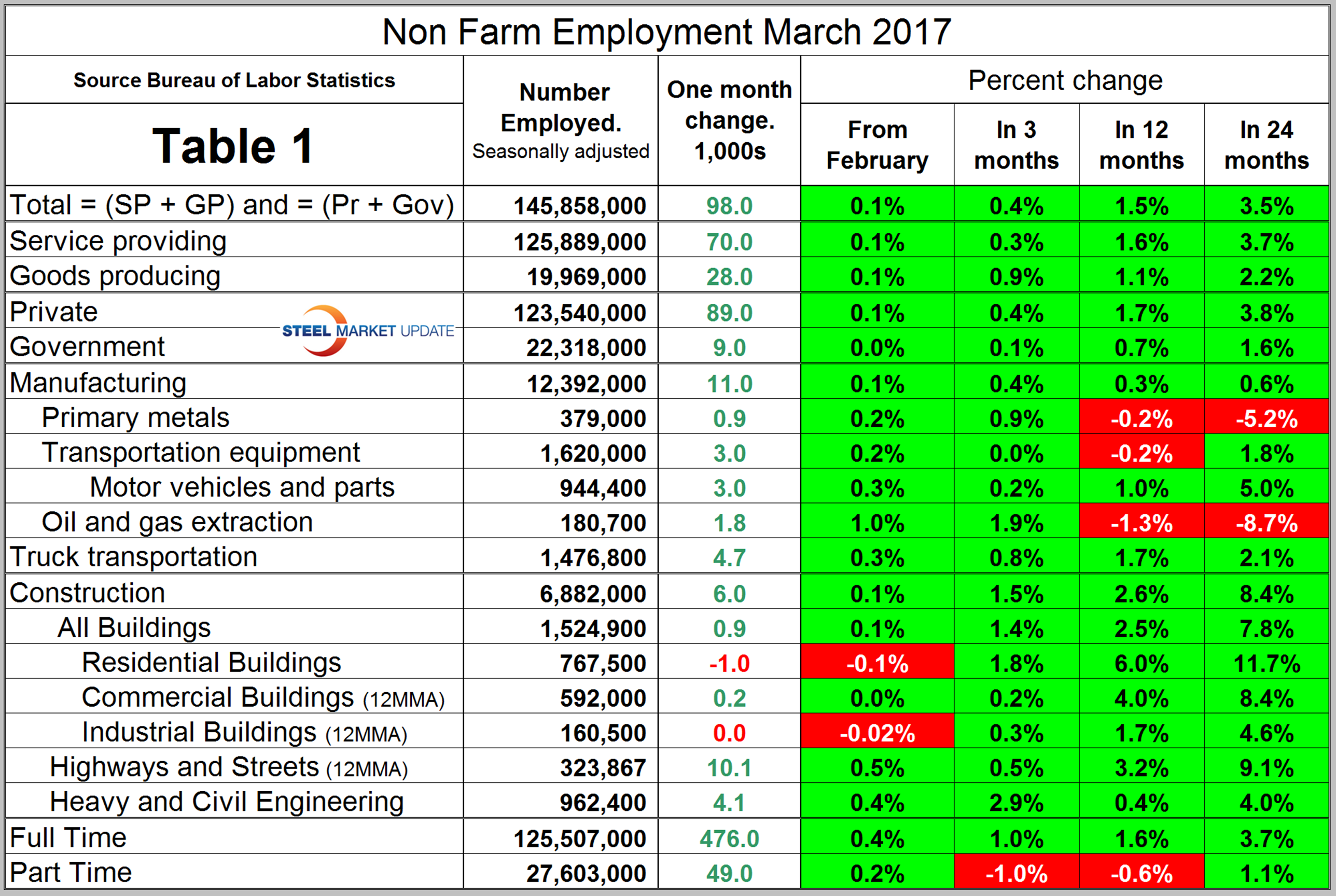 Total employment equals the sum of private and government employees; it also equals the sum of goods producing and service employees. Most of the goods producing employees work in manufacturing and construction and the components of these two sectors that we consider to be of most relevance to steel people are broken out in Table 1. In March, 89,000 jobs were created in the private sector and government gained 9,000. The Federal government lost 1,000 as local governments gained 9,000 and state governments gained 1,000. Since March 2010, the employment low point, private employers have added 16,283,000 jobs as government has shed 158,000. In March service industries expanded by 70,000 as goods producing industries driven by both construction and manufacturing expanded by 28,000. Since March 2010, service industries have added 13,783,000 and goods producing 2,342,000 positions. This is part of the reason why wage growth has been slow since the recession as service industries on average pay less than goods producing such as manufacturing. As total employment was revised down by 38,000 jobs in January and February, goods producing was revised up by 4,000 jobs.