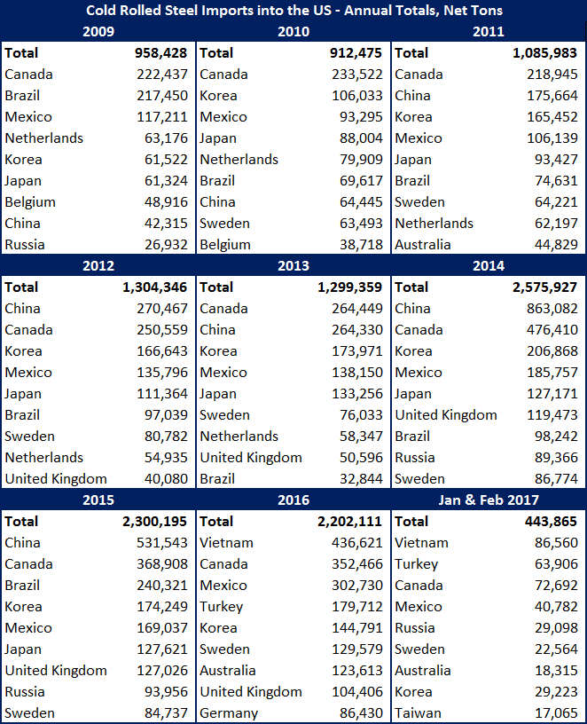 Based on the first two months, 2017 is on pace to become the biggest year for cold rolled imports. At the current pace, the U.S. would import 2,663,190 tons.