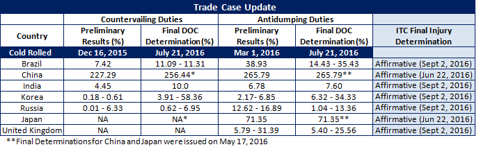 The final determinations were affirmed by the ITC in late June (Japan, China) and early September (all others) 2016. Antidumping deposit rates ranged from zero (Japan & UK) to a high of 256.44 percent (China) while Countervailing Duties ranged from 1.04-13.36 percent (Russia) to a high of 265.79 percent (China).