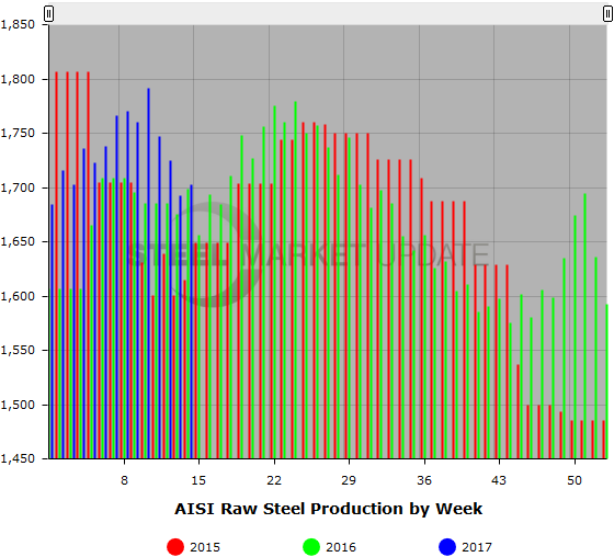 SMU Note: Below is a graphic showing the weekly raw steel production history. To use the graphs interactive capabilities, you must view it on our website. You can do this by clicking here. If you need help navigating the website or need to know your login information, contact us at info@SteelMarketUpdate.com or by calling 800-432-3475.