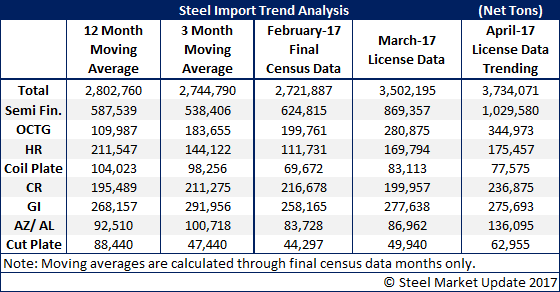 Around the middle of the month Steel Market Update (SMU) will analyze the US Department of Commerce Steel Import Monitoring & Analysis (SIMA) system to see how foreign steel imports are tracking and project total imports for the month based on the mid-month daily average. What we have been tracking is a very high number of steel import licenses both in March and now again in April. We anticipate both months will end up well over 3 million net tons of imports, well above both the 12-month and 3-month moving averages.