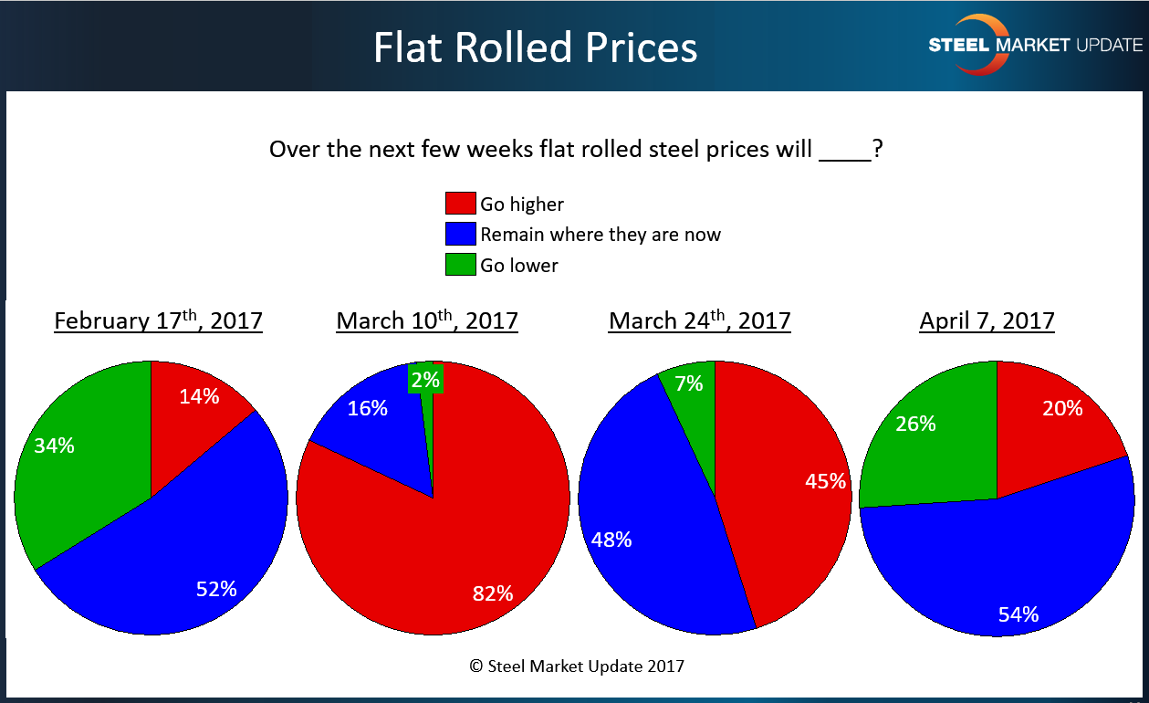 Look at the graphic below, over the past four surveys, buyers and sellers of flat rolled steel have been jumping about when it comes to where they believe flat rolled steel prices will be over the next few weeks. How hard is it to project pricing over a few week period? Normally, during an up or down cycle the direction of pricing is clearly understood. That does not appear to be the case right now.