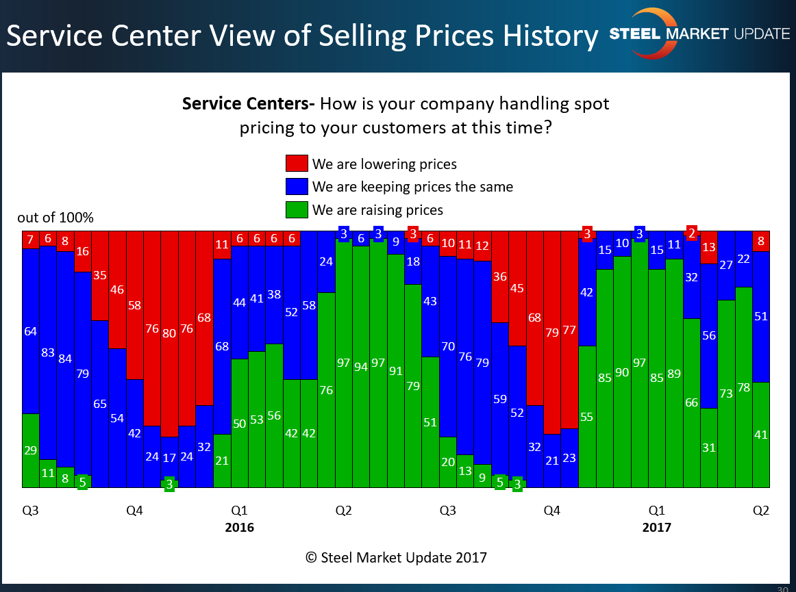 The issue we are seeing in the data is one of insecurity. As you can see by the graphic above, the service centers over the past four or five survey periods (2-2.5 months) are confused as to what they should be doing with spot pricing. It appears the desire is to keep the numbers up, but doubt at some service centers is holding them back.