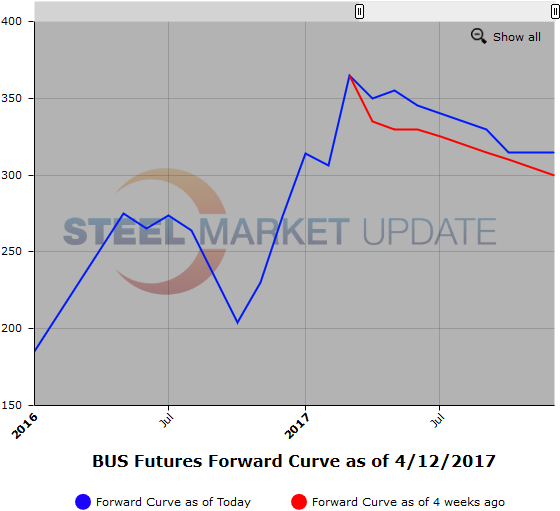 April’s BUS index surprised dropping $15/GT to $350/GT. However, early chatter has BUS potentially trading higher as some participants who held back buying for April will likely be in the mix for May. Increasing inquiries from U.S. importers of scrap/pig iron on the heals of rising oil prices and pig iron prices could add to prime scrap demand. The BUS futures curve remains relatively unchanged with 2H’17 offered at $325/GT and Cal’18 offered at $315/GT.