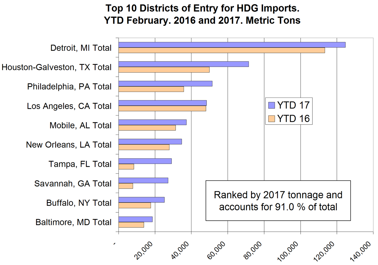 The chart shows graphically the tonnage of HDG that entered the top 10 districts in YTD February for 2016 and 2017 and is ranked by 2017 tonnage. These 10 districts account for 91.0 percent of the grand total in 2017. Detroit received the most tonnage through February 2017 followed by Houston and Philadelphia.