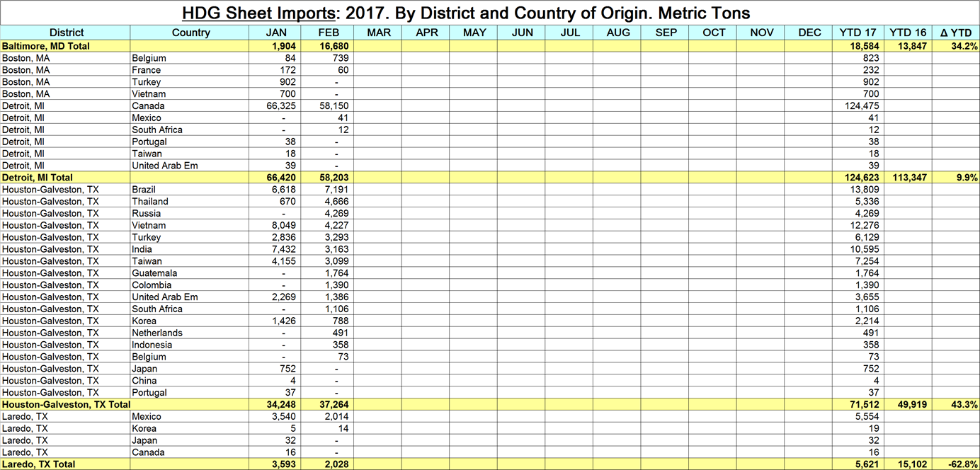 The table included here (click to enlarge) is a small extract from the data sheet for hot dipped galvanized coil. It describes the tonnage that has come in through Baltimore, Detroit, Houston and Laredo, where it came from, the YTD tonnage and the YTD change compared to 2016. The total volume of HDG through February was up by 27.1 percent year over year but Houston was up by 43.3 percent and Laredo was down by 62.8 percent.