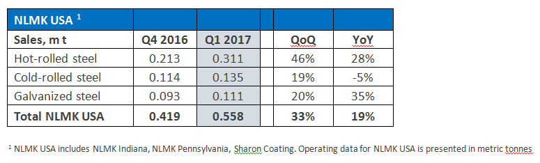 NLMK USA steel output increased by 53 percent quarter-over-quarter in Q1 2017 to 180,000 tonnes and by 15 percent year-over year.