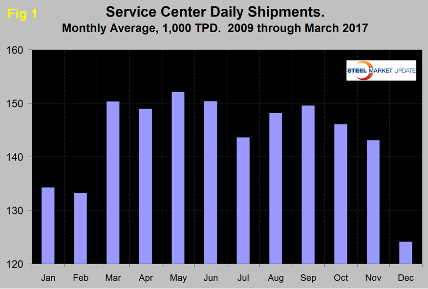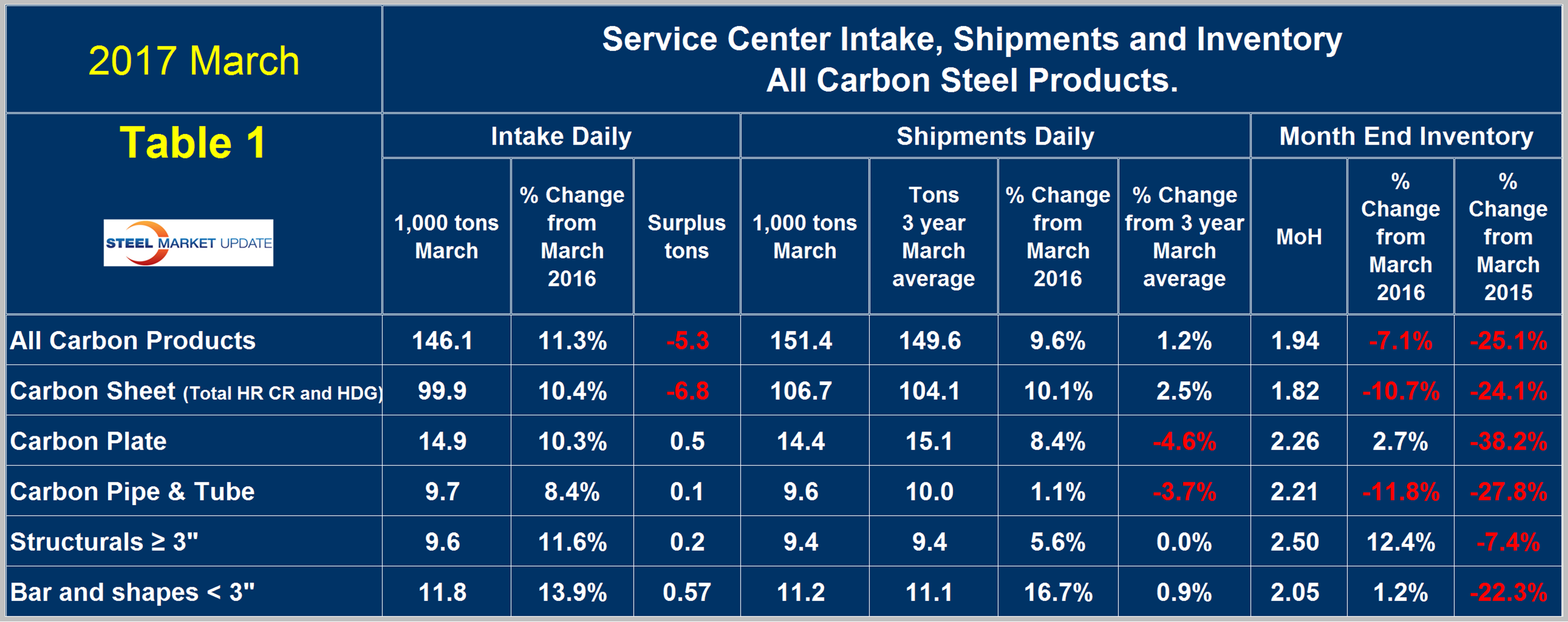 At first glance this was a good report but that impression diminished on closer examination. Year over year the report was quite good but the number of shipping days increased by three and the normal March month over month shipment surge was very muted. Daily shipments increased by 1.7 percent from February. Since 2009 on average, March has increased by 12.8 percent. Carbon steel shipments were 151,400 tons per day. The number of shipping days increased from 20 to 23.