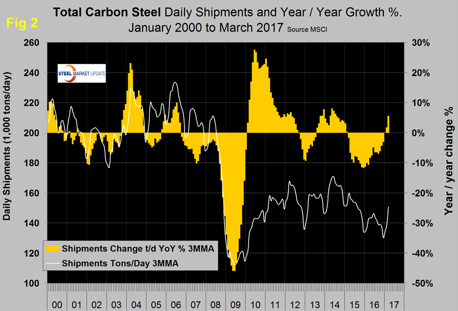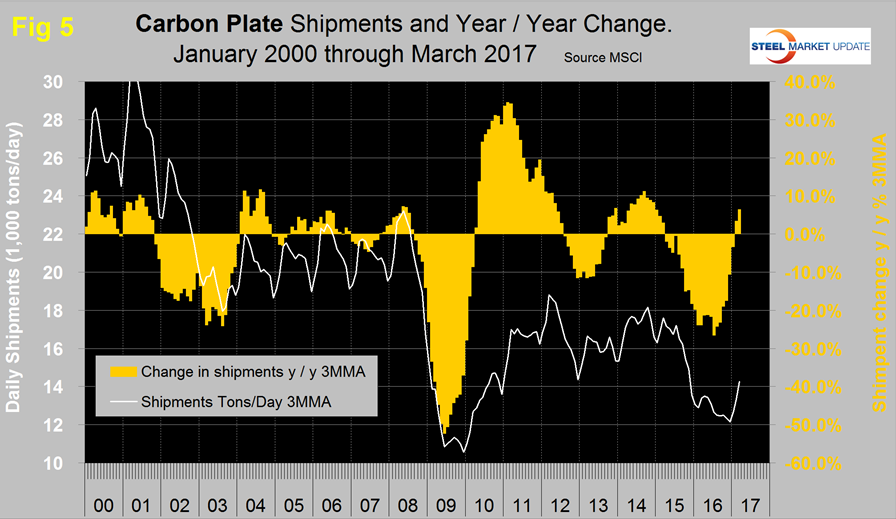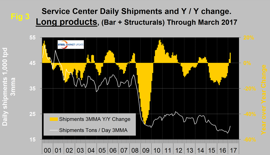 We then calculate the percent change between March 2017 and March 2016 and with the most recent three year March average. March this year was up by 9.6 percent from March 2016 and up by 1.2 percent from the three year March average. The fact that the y/y growth comparison is better than the three year comparison suggests that momentum is positive. Shipments of all products were up from March last year and shipments of all products except plate and tubulars were up from the three year average. Figure 2 shows the long term trend of daily carbon steel shipments since 2000 as three month moving averages (in our opinion the quickest way to size up the market is the brown bars in Figures 2, 3, 4 and 5 which show the percentage y/y change in shipments.)