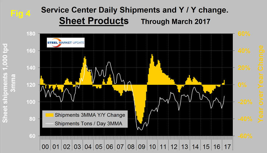 Figure 3 shows monthly long product shipments from service centers as a 3MMA with y/y change.