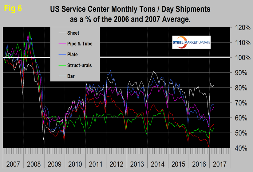 In 2006 and 2007, the mills and service centers were operating at maximum capacity, Figure 6 takes the shipments by product since that time frame and indexes them to the average for 2006 and 2007 in order to measure the extent to which service center shipments of each product have recovered.