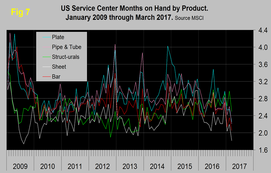 March closed with months on hand (MoH) of 1.94 for all carbon steel products, which was the lowest level in 13 years (since March 2004). Compared to March last year MoH in total were down by 7.1 percent led by sheet products which were down by 10.7 percent to 1.82 months. Plate and long products had an increase in MoH year over year. Figure 7 shows the MoH by product monthly since March 2009.