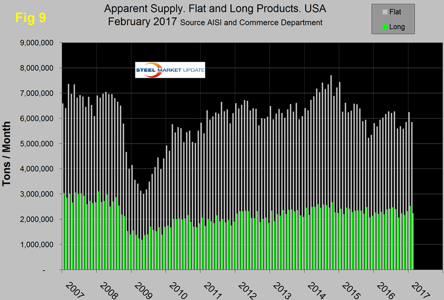 SMU Comment: In Figures 2, 3, 4 and 5, the white lines show t/d shipments. There was a decline in shipments for total carbon steel products since mid-2014 but the y/y decline halted in January through March this year. This was true for all product groups. Figure 9 shows the total supply to the market of long and flat products based on AISI shipment and import data through February which is the latest data available.