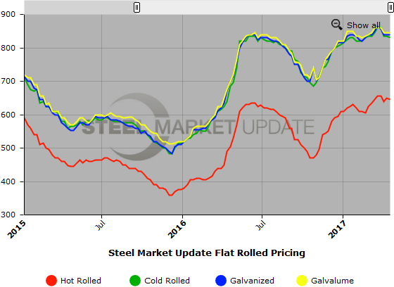 SMU Note: Below is a graphic showing our hot rolled, cold rolled, galvanized, and Galvalume price history. We will add plate prices to this graph once we have gathered a few months of data. To use the graphs interactive capabilities, you must view it on our website here. If you need help navigating the website or need to know your login information, contact us at info@SteelMarketUpdate.com or by calling 800-432-3475.