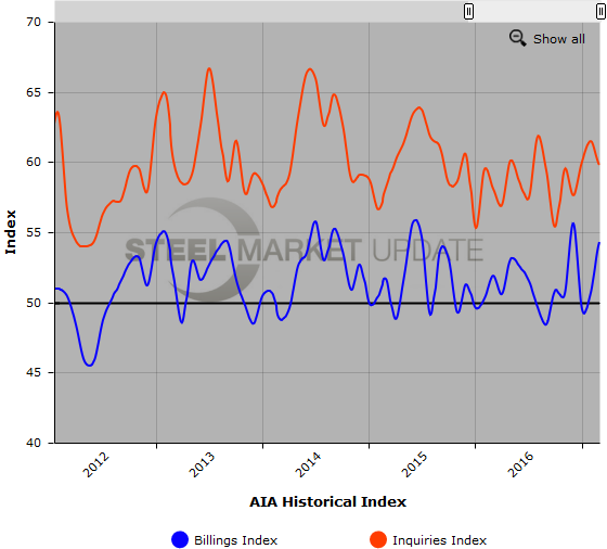 Below is a graph showing the history of the AIA Billings Index and Inquiries Index. You will need to view the graph on our website to use its interactive features, you can do so by clicking here. If you need assistance logging into or navigating the website, please contact our office at 800-432-3475 or info@SteelMarketUpdate.com.