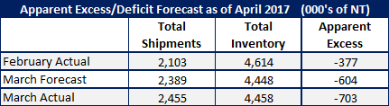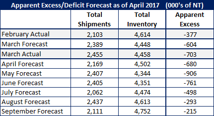 April 2017 Shipment, Inventories & Apparent Excess/Deficit Forecast