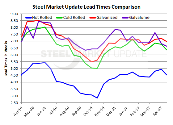 Cold rolled lead times are averaging just shy 6.5 weeks (6.37) down slightly from the 6.78 weeks reported at the beginning of this month and well below the 7.62 weeks we reported during the middle of April 2016.