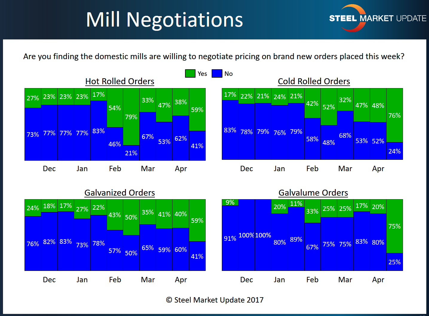 Based on the responses from those taking our survey, 59 percent reported the domestic steel mills as willing to negotiate hot rolled prices, 76 percent reported mills as willing to negotiate cold rolled prices, 59 percent reported the mills as willing to negotiate galvanized prices and 75 percent said the mills were willing to negotiate Galvalume prices.