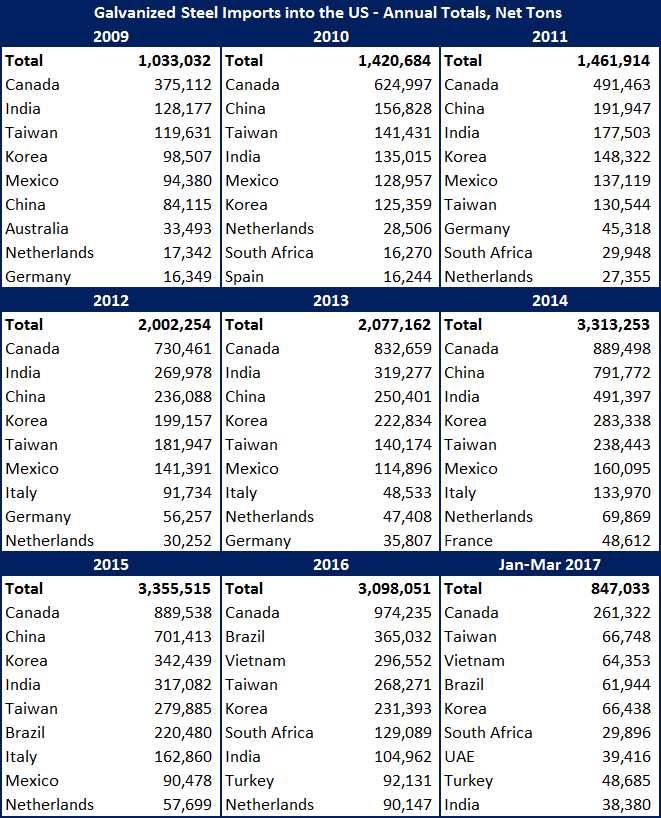 Steel Market Update (SMU) has been going through the import data as presented by the U.S. Department of Commerce going back to 2009 (Great Recession) and looking at the market as we came out of the Great Recession. In 2009, 2010 and 2011 galvanized imports were 1 to 1.5 million net tons. In 2012 and 2013 the tonnage barely broke through 2 million tons. Since then, imports of hot dipped galvanized have exceeded 3 million net tons with the high being 3,355,515 net tons in 2015 resulting in the AD/CVD suits which were filed on CORE (corrosion resistant products) in June 2015.