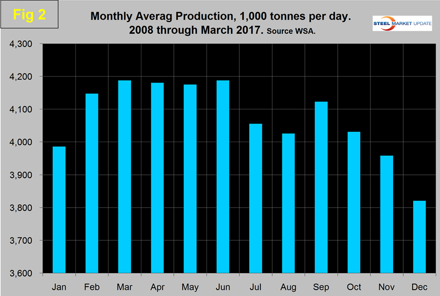 As we dig deeper into what is going on we start with seasonality. Global production has peaked in the summer for the last seven years. Figure 2 shows the average tons/day production for each month since 2008.