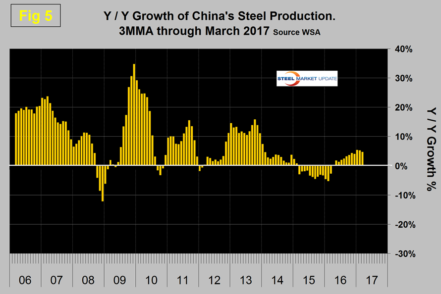 China’s production after slowing for 13 straight months year over year returned to positive growth each month in May through March on a 3MMA basis. It may look from Figure 4 as though China’s production is falling but on a y/y basis this is not the case. Therefore the slowdown in Chinese steel production that they have been promising is not happening.