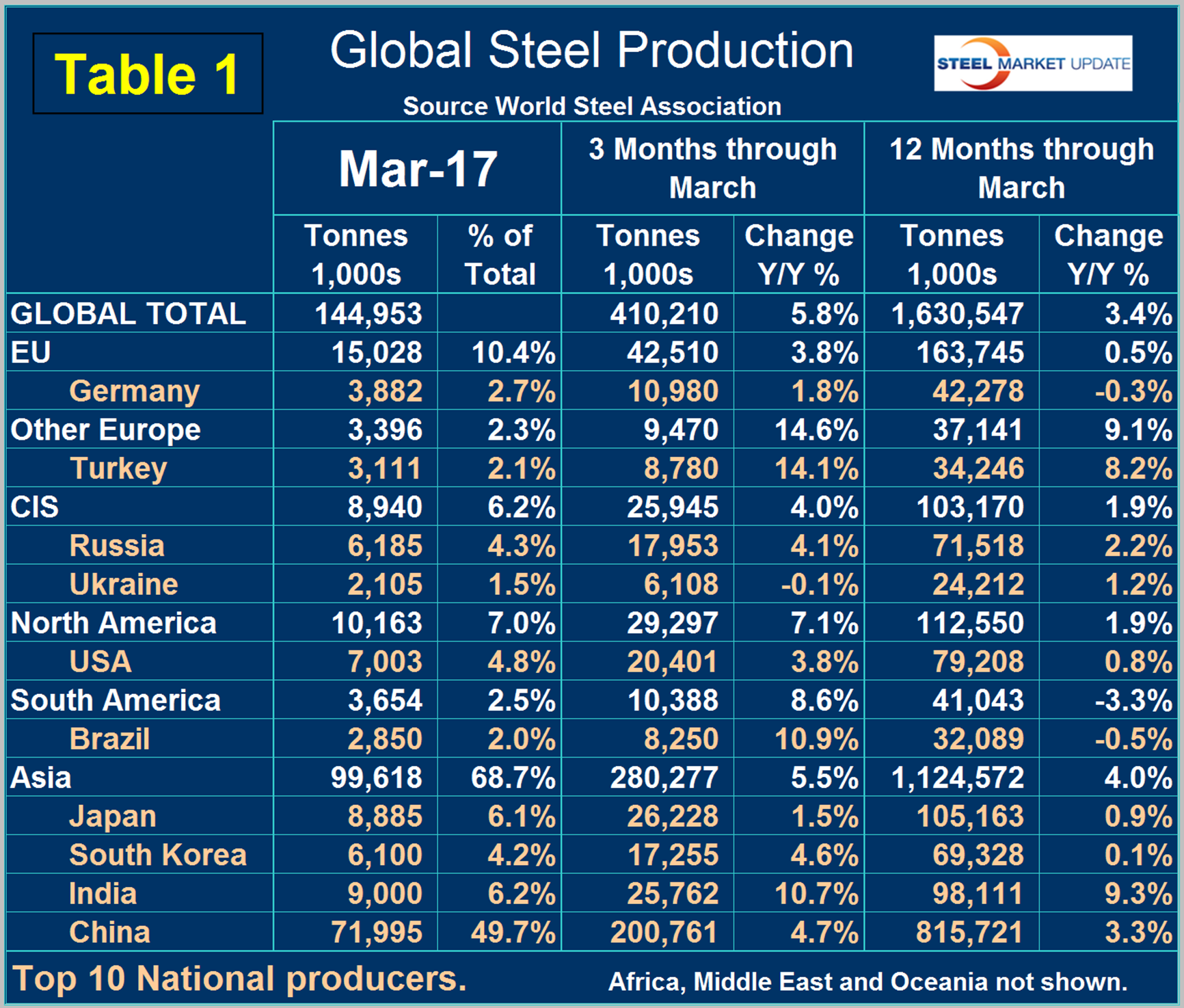 In 3 months through March y/y every region and all of the top 10 producing nations had positive growth. Asia as a whole was up by 5.5 percent with India up by 10.7 percent. Other Europe (mainly Turkey), was up by 14.1 percent and North America was up by 7.1 percent. Within North America the US was up by 3.8 percent, Canada was up by 7.1 percent and Mexico up by 24.1 percent. In Q1 2017, Mexico produced 25 percent more steel than Canada.