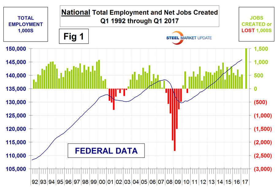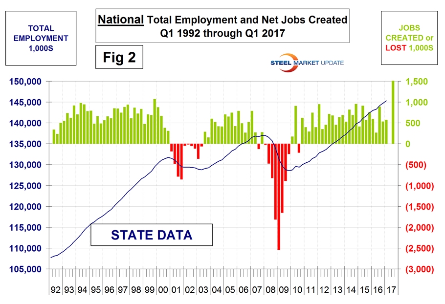 The states compile their employment numbers independently of the Feds, and then both are reported by the Bureau of Labor Statistics. The results are close. In the last seventeen quarters since Q1 2013, the Feds reported total job creation of 10,794,000 and the states reported 10,959,000 a difference of only 0.15 percent. Part of this small discrepancy is that the Feds capture off shore military personnel but the states don’t. Figures 1 and 2 show the history of Federal and State totals since 1992. SMU has graphs in the same format for 10 geographic regions and can produce for individual states if a reader so requests.