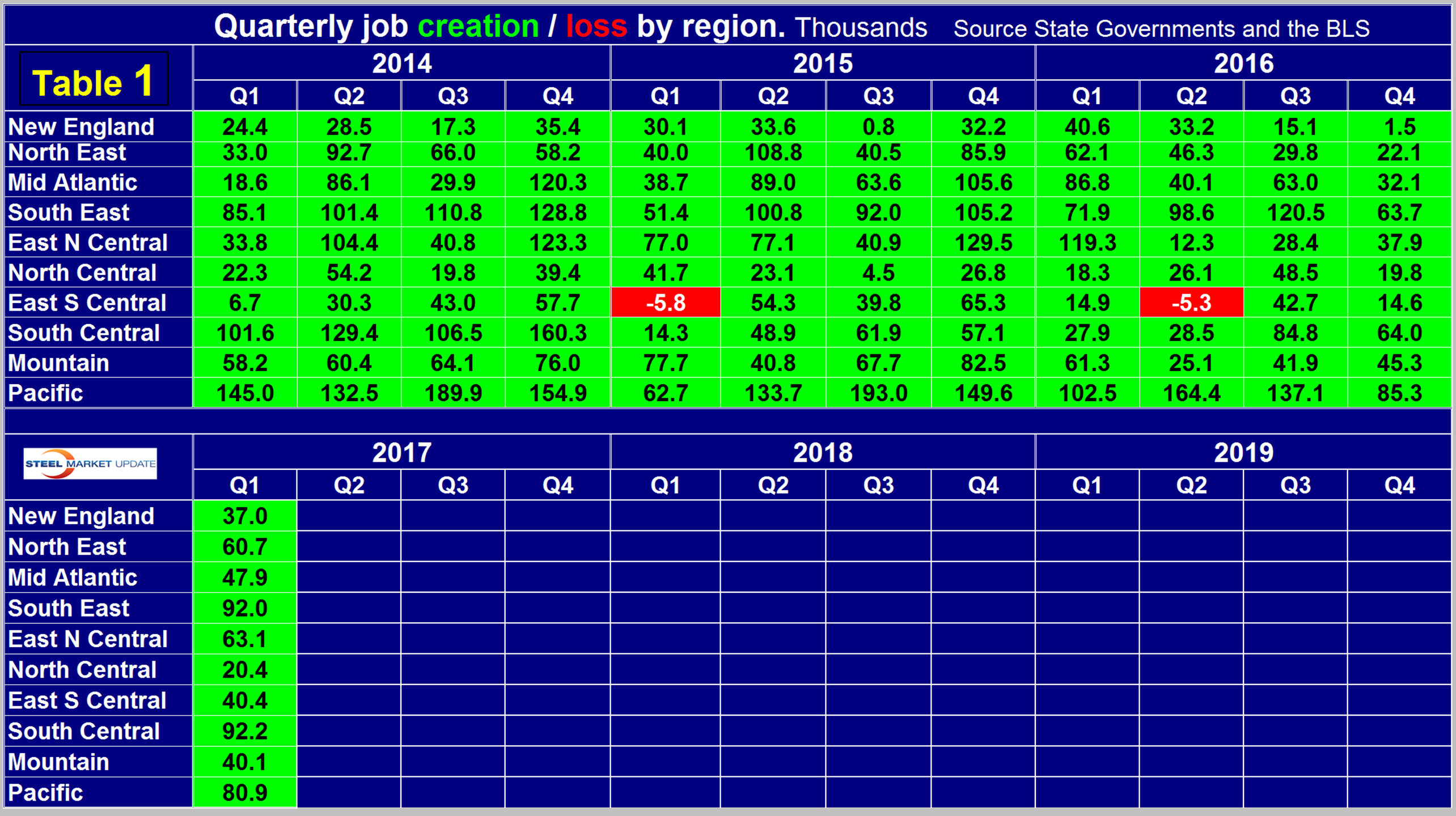 Table 1 shows the history of quarterly job creation by region since Q1 2014.