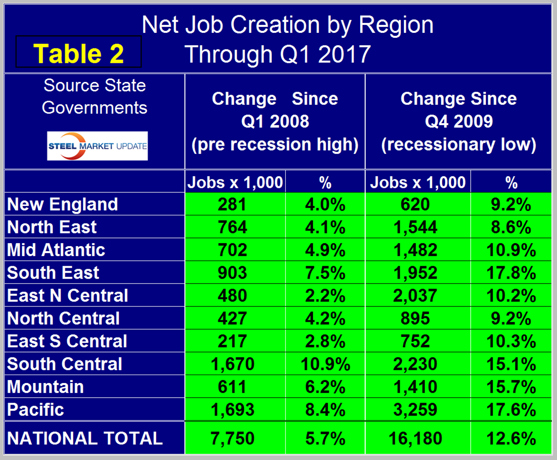 The regions have fared very differently since the pre-recession high of Q1 2008 and since the low point of Q4 2009. There are now 7,750,000 more people employed than there were immediately before the recession but of that number almost half occurred in the South Central, and Pacific regions (Table 2).